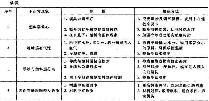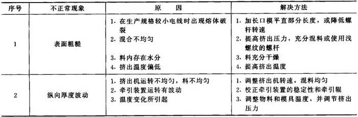 线缆生产中易出现的不正常现象、原因及解决方法见表14-4。