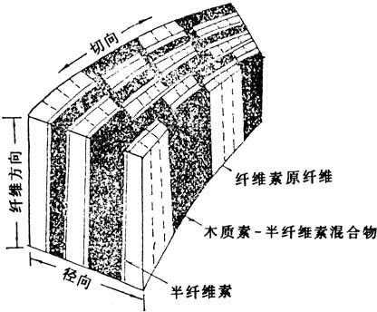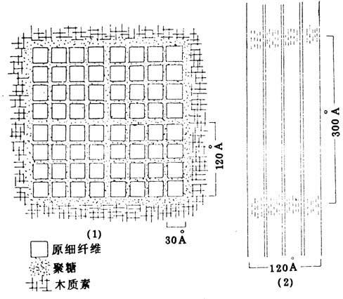 在植物纤维原料的超微结构中,已介绍了纤维细胞壁分为初生壁、次生壁外层、中层与内层。由纤维素大分子链有规则地排列聚集成微细纤维,若干微细纤维组成细纤维,再组成纤维。初生壁是由漫无规则的微细纤维构成的,而次生壁则由粗细不等的、有一定规则的微细纤维构成的。