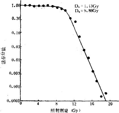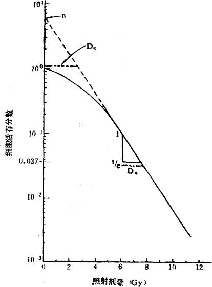 | 释义 | 细胞存活曲线 辐射对细胞群体的效应,即辐照剂量与细胞群体的活存能力(也就是对于生殖死亡的抗拒能力)之间的剂量-反应关系,可借细胞存活曲线得到定量的表达。所观察的细胞群体可以是在体外培养的细胞系,也可以是在体内受到照射后在体内或在体外测试的。 细胞的存活曲线(也称为剂量-存活曲线)是绘制在半对数坐标纸上的。坐标的横轴为算术刻度,从原点向右表示各单次照射剂量的增大;纵轴为对数刻度,表示细胞群体受不同剂量照射后存活的分数。若以照射前的细胞数目作为100%(或以其商1,即100)标示,则照射后的存活分数相当于照前的百分数(或其商,或10的负指数)标示。图2-1为一模式图。图中的曲线是由“肩部”(低剂量范围内的弯曲部分)和“指数部”(较高剂量范围内的直线部分)组成的。曲线中有三个参数:(1)将指数部的直线向左上方延伸,直到与纵轴相交,交点处的纵轴上的数值被称为外推值(n);(2)由存活分数为100向右方引一与横轴相平行的直线,直至与上述延线相交。与这一线段相当的横轴上剂量的大小被称为准阈剂量(Dq);(3)在指数部直线上的任一点向下方绘一与纵轴相平行的垂直线段,使其长度达到相当于起始点数值的37%(即1/e)的那一点为止。然后再由此垂直线终点处向右方引一平行于横轴的水平线,直到与指数部的直线相交。这一水平线的长度所相当的剂量即为平均致死剂量,亦即指数部直线的斜率(D0)。