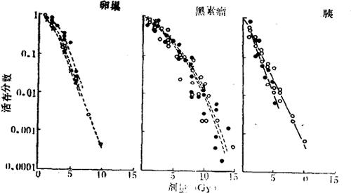 图2-3 人几种恶性肿瘤细胞的存活曲线 恶性卵巢肿瘤(三种)、黑素瘤(两种)和胰腺癌(两种)细胞。黑素瘤细胞的肩部较另外两类恶性肿瘤细胞者宽得多。 |