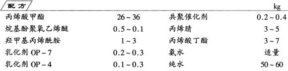 (1)在装有搅拌器、冷凝器、温度计及滴液漏斗的反应器中,依次按配比量加入丙烯酸甲酯、丙烯酸丁酯、丙烯腈、羟甲基丙烯酰胺,再加入2/3体积的纯水、共聚催化剂、烷基酚聚氧乙烯醚、乳化剂OP-7、乳化剂OP-4,快速搅拌30~40min,经充分乳化后将此乳化液移入滴液漏斗中待用。
