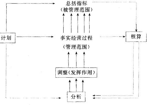 被管理系统或它的因素与管理机关(调整机构或管理系统)之间的正向关系和反馈关系,对于任何系统的管理都具有重大的意义。正向关系是“系统”中各种因素的结合方式。在这种方式中,一个因素的输出会成为另一个因素的输入,这种关系从管理机关通向被管理系统。反馈关系是把该“系统”中同一因素的输出和输入直接(或通过其他因素)结合在一起,它的方向是被管理系统通向管理机关。在任何系统中,这种反馈关系都是进行调整(管理)的必要条件。 二、经济活动的管理控制 经济活动的目的是用生产资源和财政资源的最小耗费事实实现社会产品的生产和流通。经济活动的管理只能根据一些指标来进行。这些指标要从数量上说明经营过程和经济现象,当然也要密切联系它们的质量内容(经济内容和技术内容)。指标可分为单一指标和综合指标。任何其具完整的经济涵义或技术涵义的概念和形成某种不必进一步分解的数据,都叫做单一指标。归纳和汇总各种单一指标,就构成了综合指标,即总括指标或总分类指标。单一指标(例如,第×车间全天生产发电机10台)可以汇总为综合指标(第×车间全月生产发电机300台);当计算工厂各车间全月生产的发电机总产量时,第×车间全月的发电机产量指标又可看作是单一指标,因为全厂发电机的总产量等于各车间产量的总和。综合指标又可分解为简单综合指标和复杂综合指标,前者象上述的例子那样,是用总和的方法求得的;而后者则是在总括和重新计量有关数据的基础上求得的。 例如成本,利润等。 总括的经济指标能表明经济活动的成果,当然也能表明实现既定目的的程度。这些指标是在许多因素的影响之下形成的。例如,技术因素,组织因素,经济因素,社会因素,法律因素,心理因素和其他性质的因素,都能发挥不同的作用。更动重新归纳各种指标,就能实现对整个经济活动系统的管理。由此可见,对任何已经组成的经济系统(企业,联合公司,部门等)进行管理的目标,就是要调整那些用价值表现的总括指标。因此,这些指标叫做被管理范围。对于被管理的指标可能有许多因素发挥作用,这些因素叫做管理范围。管理的涵义就在于:要建立一种使各种因素发挥作用的制度,并保证那些货币表现的总指标能达到计划水平。 三、经济核算在经济管理活动中的地位 在经济活动的计划、核算和分析过程中,能够提供正向关系的反馈关系的信息,利用这些信息就能调整经济活动。 我们利用一个特定的图式来研究这种调整的信息关系。在这个图式中表明一个用价值表现的总括指标的管理程序,如图表1-2所示。 图表1-2 根据总括指标对经济系统进行管理的模式