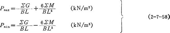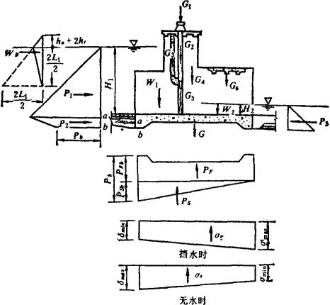 式中 γ——水的重度(kN/m3) h0——波浪中心线高出静水位的高度(m) 当闸前水深H> 波浪压力的合力作用于分布图形的重心上(图2-7-64)。 (5)扬压力 包括渗透压力和浮托力,作用方向为垂直向上。 (6)地震力 在地震区修建水闸时,应考虑地震对水闸的影响,根据《水工建筑物抗震设计规定》计算地震力。 2.闸室在不同工作情况下的稳定计算 (1)闸刚建成,上下游无水,且无地下水时,此时无水平推力,阻滑不需考虑,且可能产生最大的地基反力(Pmax),其计算公式如下: