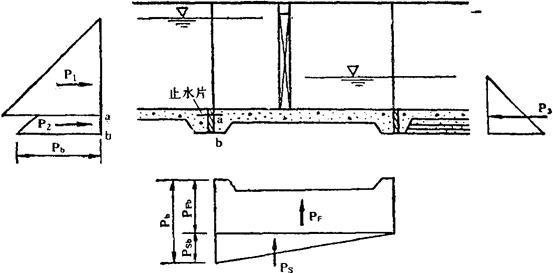 图2-7-62 水闸的作用力 P1、P2、P3-水压力 WB-波浪压力 G-底板重 G1-启闭机重 G2-工作桥重 G3-胸墙重 G4-闸墩重 G5-闸门重 G6-公路桥重 W1、W2-水重 PF-浮托力PS-渗透压力 σS-地基反力 2hl-波浪高度 2Ll-波浪长度 (1)自重,是闸室自身的重量。包括底板、闸墩、胸墙、工作桥、公路桥、闸门及闸门启闭设备等的重量。 (2)水重,是闸室范围内底板上所承受的水体重量。 (3)作用于胸墙、闸门、闸墩上的水平水压力。 当闸前设有粘土铺盖时(图2-7-63),a点仍按静水压力计算,b点则取该点的扬压力(渗压力和浮托力),a、b点之间按直线变化。