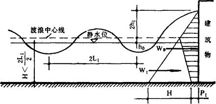 图2-7-64 波浪压力分布图 当建筑物迎水面为垂直的或陡于1∶1、水深H满足