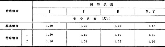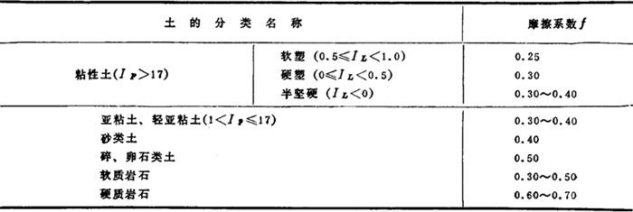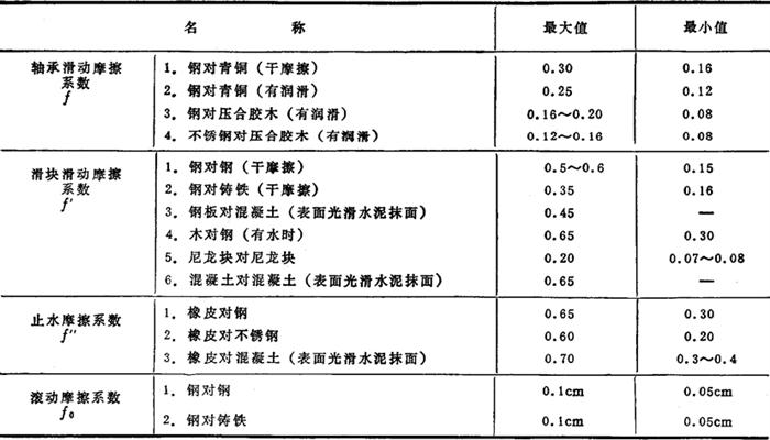 注:(1)特殊组合2的安全系数适用于遭遇地震时的载荷组合。 (2)特殊组合1的安全系数适用于特殊组合2以外的其他情况。 f——底板与基土间的摩擦系数。重要的闸要由试验确定,较小的闸或初步设计时可参用表2-7-26所列数值 表2-7-26 摩擦系数