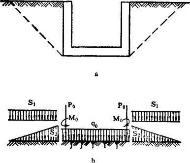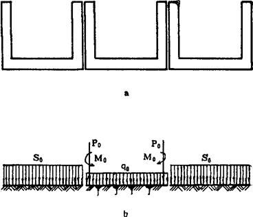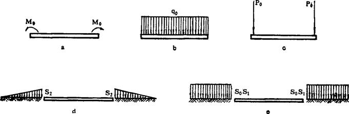 图2-7-66 多孔闸室截面和多孔闸室力系图 a-多孔闸室截面 b-多孔闸室力系图 图中M0、P0为外力矩和竖向集中外力,它们作用在闸墩和底板的交点处,各等于所有作用在梁端的力矩和竖向力(包括闸墩本身重、上部结构如公路桥或工作桥、胸墙等传来荷载)的代数和;q0为底板自重及作用在底板上的水重(包括浮托和渗压力);S0为相邻结构物的荷载;S1、S2为两旁附加荷载(如两岸土堤重,开挖回填土重等)。 根据工作情况,算得各力的数值后,按图2-7-67各种图式分别利用弹性地基梁图表进行内力计算,然后进行迭加,验算底板强度和配置钢筋。