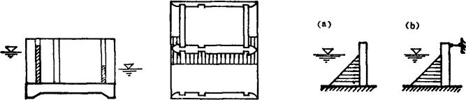 图2-7-67 垂直水流向各种典型力系图 a-板上负有对称力矩 b-板上负有均布荷载 c-板上负有对称集中力 d-两旁有对称三角形附加荷载 e-两旁有对称均布附加荷载 弹性地基梁法的计算结果与实际比较符合,通常对地基较差、工程规模较大及重要的水闸,多采用此法。 2.闸墩计算 闸墩在结构上应满足强度和稳定的要求。由于闸墩的长度和厚度较大,闸墩与底板接合处的抗剪强度也较高,一般可不进行闸墩的稳定验算。 对闸墩的强度校核,主要包括顺水流向和垂直水流向的两个方面。 (1)闸墩纵向强度校核 根据闸前、闸后最不利的水位情况,按偏心受压公式计算出闸墩与底板结合面的应力。 (2)闸墩横向强度校核 横向最不利的荷载作用情况,如图2-7-68所示,为修理时期闸墩侧向所受水压力的情况。
