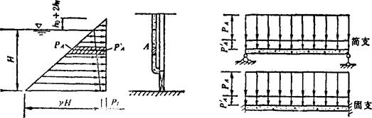 图2-7-68 修理时期闸墩受力情况 计算时,沿闸墩纵向截取1m宽为计算单位,仍用偏心受压公式计算墩底应力(图2-7-68a)。 当闸墩上设有横向加劲梁时,可认为闸墩是下端固定、上端铰支的构件,其计算如图2-7-68b。 3.胸墙计算 中小型水闸中常采用板式胸墙。计算时,沿高度截取1m高的水平条,作为承受均布荷载q的简支梁或固支梁,进行内力计算及配筋。均布荷载强度q为该条中心线处静水压力强度与波浪压力强度之和(图2-7-69)。