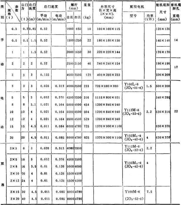 f0——滚动摩擦系数,见表2-7-27 pf′——滑块支承由闸门水压力P所引起的摩擦力(kN) f′——滑块与滑道之间的摩擦系数,见表2-7-27 Ts——止水摩擦力,Ts=止水数目×止水长度×止水中心处水压强度×止水宽度×止水与门槽的摩擦系数f″(f″见表2-7-27)(kN) G——门重(包括加重块重)(kN) 1.1——门重的增大系数 W——门顶水柱重(kN) Pt——门的浮托力(kN) K——安全系数。用电动启闭时,取K=1.2~1.4;若用人力手摇,且门底用橡皮止水时,可取K=1.1;若门底用止水木时,可取K=1.15 启门力求出后,并考虑留有一定的余地,即可按表2-7-28选用启闭机的型号。 表2-7-28 启闭机型号的选择
