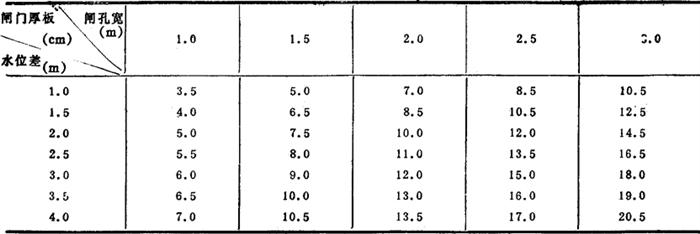 注:本表为河北省黄骅县五一机械厂产品资料,其他规格的启闭机见《起重机械产品样本》。 5.木闸门厚度设计 上提式平面闸门系根据二端自由支持的简支梁公式计算。依照水压力理论,愈靠近闸底,其所受压力愈大,但海盐场中、小型平面闸门都采用厚度一致的木板,设计时可按表2-7-29选用。 表2-7-29 松木闸门板厚度表