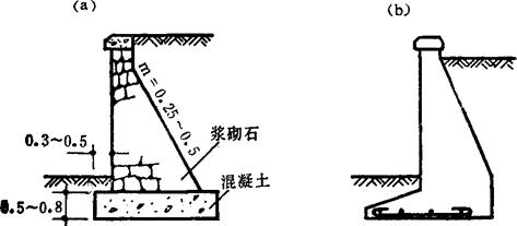 图2-7-70 重力式挡土墙(单位:m) 重力式挡土墙一般应用偏心受压公式校核其强度。 (2)悬臂式挡土墙(图2-7-71) 为钢筋混凝土建造的轻型结构,一般形状有上形、L形及U形(图2-7-72)。