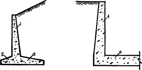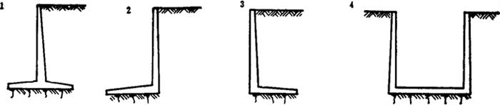 图2-7-72 悬臂式挡土墙的一般形状 1-⊥形 2、3-L形 4-U形 悬臂式挡土墙由直墙与底板两部分组成。直墙顶部厚度一般不小于15cm;底部厚度则由计算决定,常为挡土墙高的 这种形式的特点是厚度小,自重轻,可以调整底板的尺寸,以改善稳定条件和基底的压力分布。 直墙和底板都近似按悬臂梁进行计算。 |
