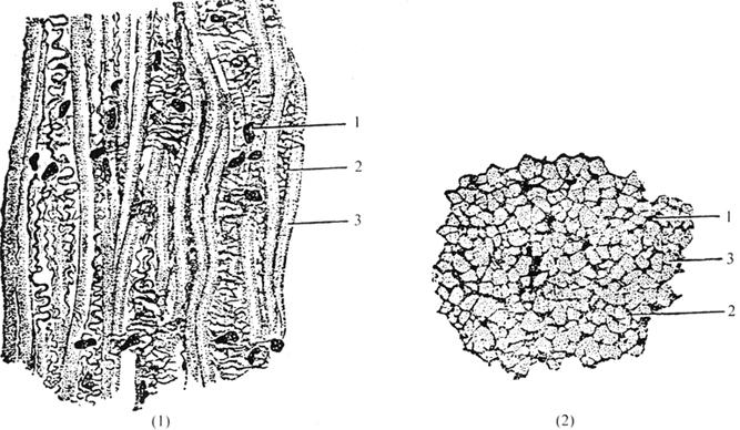 1-成纤维细胞核 2-肌原纤维 3-弹性纤维