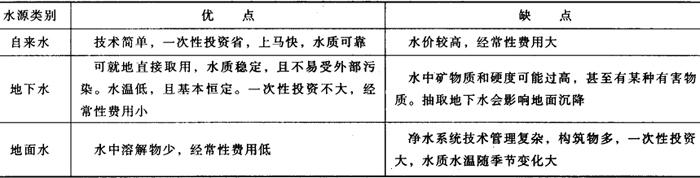 水源的选择,应根据当地的具体情况进行技术经济比较后确定。有城市自来水供应的地方,一般应首先考虑采用自来水,其次考虑地下水,再次才考虑地面水。 各种水源的比较见表5-3-2。 表5-3-2 各种水源的优缺点比较