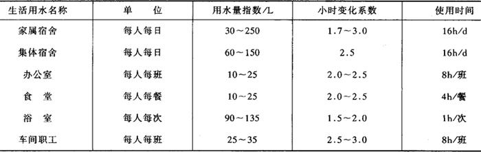 图5-3-3 地面水给水系统示意图 2.配水系统 从水塔以下的给水系统称为配水系统。小型食品厂的配水系统,一般采用枝状管网。大中型食品厂生产车间,多采用环状管网,以保证多支路进水,并确保水压稳定。 管网上的水压,在设计时要保证每个用水车间和建筑物最高层用水的水压头不小于6~8m。对于水压有特殊要求的工段或设备,可采用局部增压措施。 室外给水管线,多采用铸铁管埋地敷设,管径选择要适宜。过大则浪费材料,太小又将过多损失压头。选择管径时,一般取管内流速不大于2m/s,压头损失在5~10kPa/1000m为宜。 3.冷却水循环系统 食品厂的制冷机房,车间空调机房等常需要大量的冷却水。为减少全厂总用水量,常设置冷却水循环系统和可降低水温的装置,如冷却池、喷水池、自然通风冷却塔和机械通风冷却塔等。为提高效率和节省用地,广泛采用机械通风冷却塔,这种冷却塔具有冷却效果好、体积小、重量轻、安装使用方便,并只需补充循环量的5%~10%的新鲜水,这对水源缺乏或水费较高且电费不高的地区,特别适宜。 4.消防给水系统 食品厂的消防给水管,多数与生产、生活给水管合并。室外消防给水管网以环状管网布局为宜。用水量小于15L/s,可以采用枝状管网。消火栓应设在十字路口,消火栓安置按防火要求设计。 室内消防给水管的直径不小于100mm,并要保证消防构筑物最高点的管内水压不小于10kPa。室内消火栓要配置双股水柱,每股水量不小于2.5L/s,充实水柱长度大于7m。室内消火栓,置于明显易取地段,其距离不大于50m。 (三)全厂用水量的估算 全厂用水包括:生产用水、生活用水和消防用水。 1.生产用水量 生产用水包括所有生产工艺过程用水、锅炉用水以及制冷系统用水。 生产用水量标准是指单位产品的用水量(m3/T)或单位生产设备单位时间的用水量(m3/台·h)。它随产品种类、工艺过程、设备类型、机械化、自动化程度的不同而异。焙烤食品的调配用水量为:每吨面包用水为0.45~0.5m3,每吨饼干用水0.3~0.4m3。生产用水量可按下式计算: W产=∑N产·q产(m3/d) 式中 N产——最高日产量(t/d); q产——单位产品用水量标准(m3/t)。 锅炉用水量按锅炉蒸发量的1.2倍计算,小时变化系数取1.5。 制冷机的冷却用水,可按下式计算: Wc=Qc/1000(t2-t1) (t/h) 式中 Wc——冷却用水量(t/h); Qc——冷凝的热负荷(kJ/h); t2——冷却水的出水温度(℃); t1——冷却水的进水温度(℃)。 一般情况下,取t2≤36℃,t1≤32℃。制冷循环系统补充水量,按循环量的5%计。厂内自用车辆冲洗用水,可按经验,小型车:250~400L/d计算;冲洗时间10~20min,大型车按400~600L/d计算,冲洗时间15~20min。 2.生活用水量的估算 生活用水量的多少与当地气候,卫生设施情况以及人们的生活习惯有关。设计时可参照当地同类企业耗水量计算,也可直接查表5-3-3后再用下列公式计算。 表5-3-3 生活用水计算参数