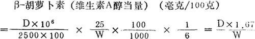 式中:D:消光度; W:样品的重量(克); 0·3:每0.3微克维生素相当于 1830:石油醚中维生素A的 附:β-胡萝卜素的测定: (1)将(二)维生素A测定中《3②》的,β-胡萝卜素提取液用石油醚定容至25毫升。 (2)440~456毫微米波长范围内,每隔2毫微米以石油醚作对比,测定其吸收率(1厘米玻璃比色皿)。 (3)计算: