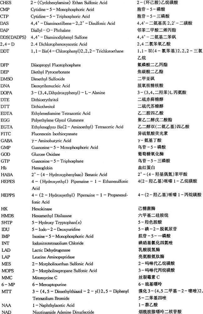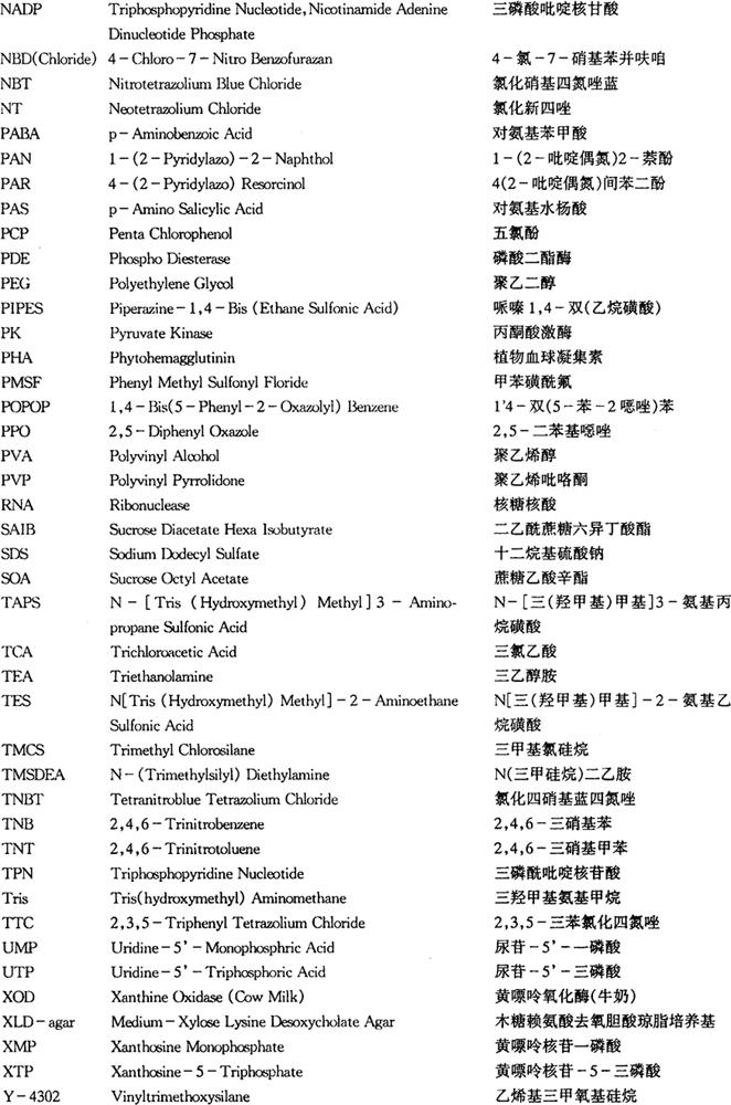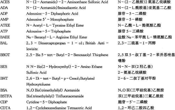 像这样以大写字头字母,或再辅之以一些数字来代表试剂名称的例子还很多,其中大多数已为用这些试剂的人所熟悉。这些缩略字也有一些特点,常见的缩略字头字母多是一些常见的元素,能团、数词……的字头,只要能掌握这些常见字的拼写,就会比较容易掌握缩略字名,下面再列举些常用缩略字为代表,帮助大家掌握它们的特点。