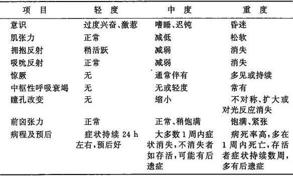 | 释义 | 缺氧缺血性脑病 【释义】: 新生儿缺氧缺血性脑病(HIE)是围产期缺氧的严重并发症。病情重,病死率及伤残率高。 【诊断】: 1.临床表现 (1)症状 有围产期缺氧史,生后12h内出现异常神经症状、意识障碍、肌张力及原始反射改变和脑干功能(瞳孔、眼球震颤、呼吸节律)改变。 (2)体征 将本病分为轻、中、重三度,见表4-2。 表4-2 HIE临床分度标准