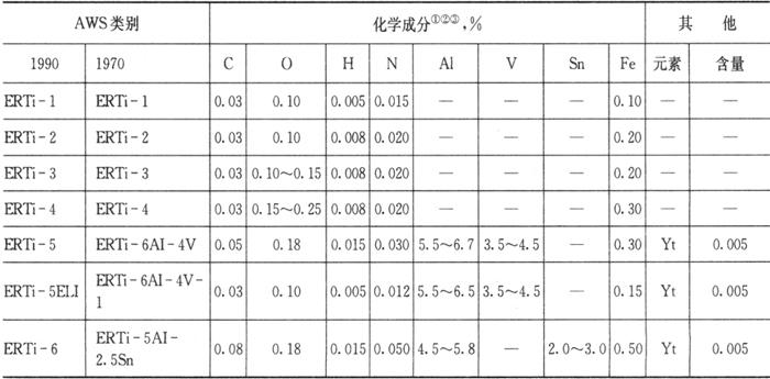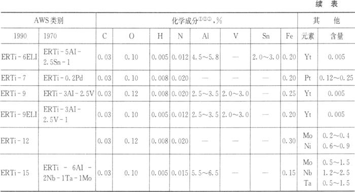 表中同时列出了1990年和1970年的AWS类别,以作比较。在90版标准中,字母“ELI”表示钛合金填充金属有极低的间隙元素(碳、氧、氮、氢)含量。