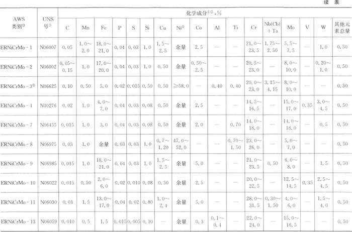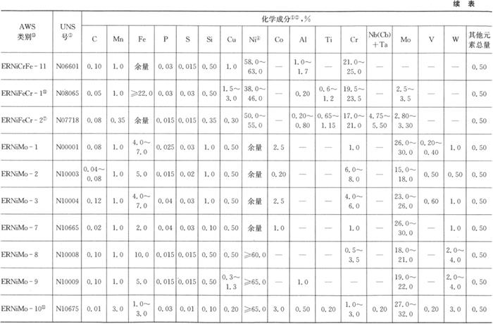 注:①应对表中给出规定数值的元素进行分析,如在常规分析中表明存在其他元素,应作进一步分析,以确定那些元素的总量不超过表中最后一栏“其他元素总量”所规定的极限值。 ②除非另有规定,表中的单个值为最大值。 ③SAE/ASIM金属和合金的统一编号体系。 ④包括伴随的钴。 ⑤如买方规定的话,铝的含量不超过0.12%。 ⑥Mil-E-21562E型,钽的含量不超过0.30%。 ⑦硼的含量最大值为0.006%。 ⑧硼的含量最大值为0.003%。 ⑨镧的含量最大值为0.050%。 ⑩Al+Ti的含量最大值为1.5%。 ⑾Mil-E-21562E型,Pb<0.010,“其他元素总量”应包括铅、锡、锌。 ⑿当规定为EN82H或RH82日时,硫是0.03~0.10。 ⒀对带极,类别号“R”应用“Q”替代。 ⒁Ni-Mo的含量为94.0%~98.0%,Ta的含量不大于0.02%,Zr的含量不大于0.10%。 从应用的观点出发,本标准中的大多数填充金属类别在ANSI/AWS A5.11/A5.11M《镍及镍合金药皮焊条标准》中有相应类别,表5.3-4列出了本标准中的焊丝类别在与.ANSI/AWS A5.11中相应药皮焊条类别的比较。 表5.3-4 类别的比较