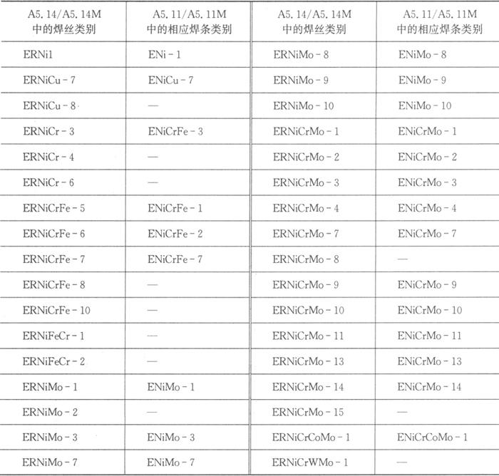 从AWS A5.14/A5.14M-1997来看,在此版的标准中增加了许多新的类别如ERNiCu-8、ERNiCr-6、ERNiCrFe-7、ERNiCrFe-8、ERNiCrFe-10、ERNiMo-8、ERNiMo-9、ERNiMo-10、ERNiCrMo-10、ERNiCrMo-11、ERNiCrMo-13、ERNiCrMo-14、ERNiCrMo-15、ERNiCrCoMo-1和ERNiCrWMo-1等。除这些类别外,由于我国等效采用美国AWS标准,其余类别与我国标准GB/T 15620-1995完全相同。 |
