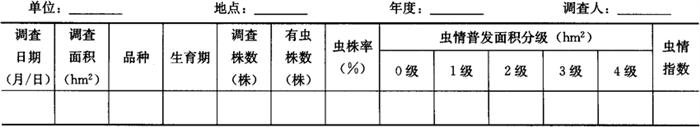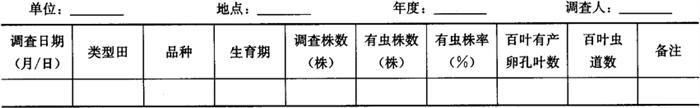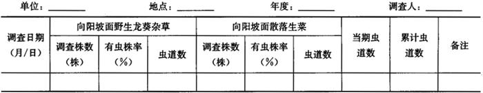 1.2 春季田间虫情系统调查 1.2.1 调查时间 当地旬平均温度稳定在16℃左右时开始到旬平均温度稳定在30℃左右终止。 1.2.2 调查方法 选当地主栽品种的黄瓜、番茄、豇豆、菜豆等易受害类型田早、中、晚茬各2块。自定植后15天以后,采用对角线5点取样法,每5天1次,每点定株5株,共取样25株,调查有虫株率、百叶有产卵孔叶数、百叶虫道数。发生较重时每点可只查1株,重发生时每点可只取查单株的上部1张、中部2张(主要产卵部位的叶片层)、下部1张共4张叶片,再按单株叶片数推算全株有产卵孔叶数、虫道数。将调查有虫株率、百叶有产卵孔叶数、百叶虫道数的结果填入表6-112。 表6-112 美洲斑潜蝇大田虫情普查结果汇总记载表