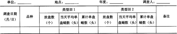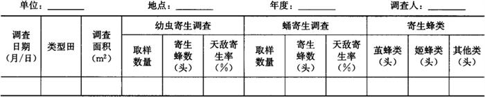 1.4 秋季田间虫情系统调查 1.4.1 调查时间 当地旬均温度降到28℃以下开始至当地旬均温度稳定降到12℃以下的时间区间。 1.4.2 调查方法 选苗龄超过15天以上的早、中、晚茬的主栽的菜豆、豇豆、黄瓜、番茄等类型田各2块。采用对角线5点取样法,每5天1次,每点定株5株,共取样25株。调查有虫株率、百叶有产卵孔叶数、百叶虫道数。将有虫株率、百叶有产卵孔叶数、百叶虫道数的调查结果填入表6-112。 1.5 害虫天敌调查 1.5.1 调查时间 春季(旬均温度18℃左右开始至25℃左右结束),每月调查1次。 秋季(旬均温度25℃左右开始至15℃左右结束),每月调查1次。 1.5.2 寄生性天敌调查方法 选在非防治区或防治较差的田间采集高龄幼虫样本(采摘有高龄幼虫的叶片放在塑料袋内,带回室内,适量放入吸潮滤纸密封饲养10~12天后,观察寄生蜂天敌数)。每次采集幼虫不少于200头,蛹不少于100头(先用适量的接蛹白盘放在田间采集,取回室内后,将蛹放在白盘内,底层用滤纸保湿,上层盖0.5~1cm细土,再将收集的蛹散放在土表,表面覆盖与盘口大小接近的白纸,盘面上覆盖透明玻璃,饲养10天后,观察白纸上的蛹寄生蜂天敌),分隔饲养观察寄生性天敌种类及其对幼虫和蛹的寄生率。将天敌调查结果汇总填入表6-114。 表6-114 美洲斑潜蝇田间寄生性天敌调查表