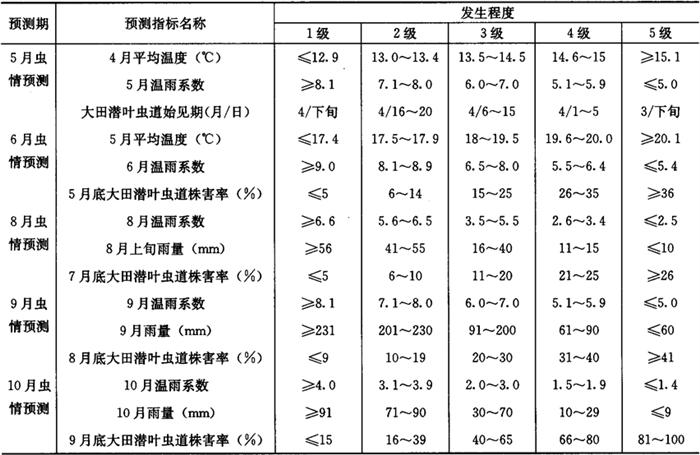 2 预测预报方法 2.1 短期预报 早春主要根据越冬代成虫的发生量、始见期的早晚、大田作物上始见产卵孔的时间,推测防治适期。 初秋主要根据越夏接蛹的发生量、大田作物上始见产卵孔的时间、近期有无大、暴雨等影响,推测防治适期。 2.2 中长期预报 根据历史发生期距、发生消长的峰型资料、当年温度变化(天气趋势预报)进行后二至数个代次的发生程度、发生期、防治适期(区间)的预报。 3 测报参考资料 3.1 发生程度分级 3.1.1 发生程度趋势预报的分级