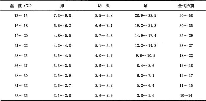 注:上海市蔬菜科学技术推广站,2004。 3.1.2 大田虫情巡回普查分级 ◆0级:无虫害; ◆1级:有虫株率≤25%; ◆2级:有虫株率25.1%~50%; ◆3级:有虫株率50.1%~75%; ◆4级:有虫株率>75%。 3.2 防治适期 防治适期应根据防治农药类型的选择、防治时机而定(如因下雨天气延误成虫发生始盛期防治或错过成虫发生高峰期的防治机会后的补救防治)。 3.2.1 防治时使用菊酯类等触杀性农药 防治适期为成虫发生始盛期。 3.2.2 防治时使用灭蝇胺类等生长调节剂类农药 防治适期为卵孵盛期至初龄幼虫始盛期。 3.3 美洲斑潜蝇不同温度下的虫态历期(天)