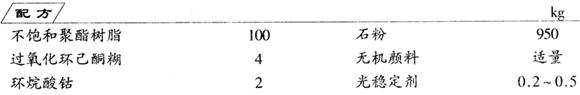 先将树脂与固化剂混合,再加入促进剂和光稳定剂,混合均匀后加入石粉搅拌混合均匀,取少量混合物与无机颜料混合,作为花纹料。按花纹制作工艺操作,震捣成型,脱模修整,即成产品。