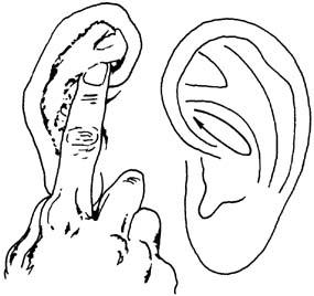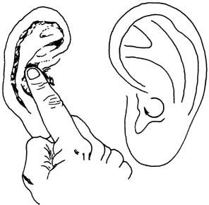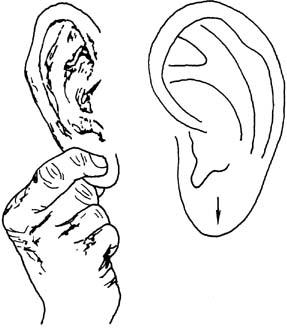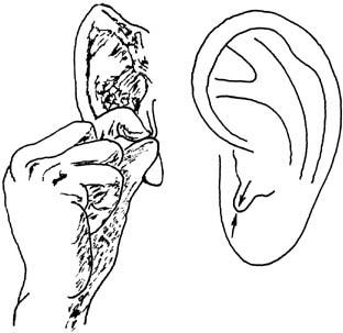 (三)全面按摩与重点按摩相结合 人体疾病是互相联系互相影响的,因而在全面按摩耳郭基础上,再在病变的相应部位进行重点按摩,对防治疾病增强体质更有利。(见图23~28,也可用于少儿的近视眼防治)
