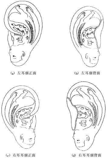 | 释义 | 耳穴研究 近40年来,上海在耳穴研究方面做了不少工作,并涉及各个方面,包括动物实验、临床实践与耳穴研究、耳针麻醉及耳穴模型等,兹分述如下。 (一)动物实验与耳穴研究 从解剖学提示,耳郭神经支配颇为特殊,它受到7条神经支配:颈Ⅱ、颈Ⅲ、三叉、颜面、舌咽和迷走神经,再加上伴随血管壁上交感神经纤维共有7条神经。据中国科学院上海生理研究所毋望远等报道:他们通过8只猴子制造人工股骨骨折形成“实验性耳郭压痛点的研究”,详细观察猴子耳郭上产生压痛点及消失的规律,又对压痛现象的神经通路传入脑部,最终到达第三脑室壁附近,为压痛点的刺激兴奋性消失的部位。另从家兔人工胃溃疡实验中发现耳郭出现大量低电阻点与胃溃疡面积的增减成正规律。各种动物实验,都反映耳郭与内脏、肢体有神经传导密切相关的联系。 (二)临床实践与耳穴研究 据“耳穴作用机制的初步探讨”报道:临床上高血压患者,经针刺或贴敷耳穴后血压就下降。胃部痉挛者,经耳穴针刺后疼痛即缓解或消失。血管神经性头痛者,经耳穴贴敷后头痛即缓解或消失。因椎动脉或颈动脉痉挛或扭曲者,经耳穴针刺后头晕就很快消失。因胃或球部溃疡胃酸分泌增加者,经耳针或贴敷耳穴后胃酸分泌就调节到正常状态,同时胃溃疡及球部溃疡愈合;反之胃酸分泌低者引起胃纳欠佳,经耳穴刺激后,胃酸分泌正常,胃口好转。另外因肱动脉痉挛引起无脉症,经针刺耳穴后,血管扩张恢复正常搏动。尤其在临床上遇到持续失眠20余年伴抑郁症者经持续贴耳穴1~2个疗程后,睡眠能维持6~7小时,抑郁症消失,精神恢复正常。 1.经络机制 凡针刺耳穴压痛点伴有放射传感者,其疗效更佳。有一例腰痛剧烈不能起床站立的患者,虽然数次急症用过镇痛剂,但都无效,患者经耳穴针刺腰痛穴,反应特别强烈且伴随膀胱经络有传感现象,患者腰痛立即消失,当场起身站立步行返家。另一例胆道蛔虫症患者引起胆绞痛伴发热、轻度巩膜黄染、恶心呕吐,经注射杜冷丁及阿托品后仍不见效,后经耳针刺激胰胆穴,当场出现拟似胆经传感,病人胆区痉挛很快消失,立即能起床活动。再一例左肾绞痛,曾去数家医院急症注射过镇痛剂,皆未见效,经耳穴探查发现左侧耳郭肾穴有明显压痛点,经针刺该穴后呈现肾经传感现象,肾绞痛立即解除。另一例乙型肝炎患者,经常有肝区隐痛,经针刺耳郭肝穴后呈现肝经传感现象,肝区疼痛即刻消失。还有一例前列腺肥大而引起排尿障碍患者,经针刺前列腺穴(艇角穴)后出现任脉传感现象,排尿逐渐通畅。又有一例胃痛患者,面色㿠白,满头大汗,经针刺胃窦部穴(十二指肠穴中点)后,立即引起胃经传感现象,胃痛慢慢缓解直至消失。总之,在实践中经针刺耳穴有经络传感者,疗效较好,为研究经络现象提供了有力依据。 2.免疫机制 通过详细观察20余例小儿多动症患者,经常患感冒,1年中至少有10余次有鼻塞、流涕、咳嗽、咽喉肿痛甚至发热等症状,经贴敷耳穴约20次,在小儿多动症症状逐步好转的同时,感冒也较以往大为减少。 150例阑尾炎患者,在耳针前测得白细胞12000/mm3左右,经耳针阑尾穴后1小时测得白细胞总数下降,至7000/mm3左右,原右下腹部疼痛、恶心、呕吐症状与体征全部消失。笔者又为30例阑尾炎患者检测耳针前后吞噬细胞吞噬细菌数的观察,发现耳针后患者吞噬细胞吞噬细菌数大大增加,同步发现凡血液中细胞吞噬细菌数增多者往往症状及体征消失得较快,呈现正相关现象。 (三)耳穴模型的研究 耳穴模型:标有61个耳穴区及45个耳穴点,共106个耳穴。特点为提出了耳正面穴位与耳背面穴位基本相对应的经验总结,并设计了耳郭背面倒置胎儿的投影图。本模型已获得国家专利(专利号:89211503)。 耳穴电动教学模型:其特点是将耳郭上106个穴区及穴点能单个显示,也能数个同时显示,并能自动地按顺序显示全部耳穴及自动讲解耳穴的位置与作用;亦能显示耳背倒置胎儿投影图。可进一步提高耳穴的教学效果。本模型已取得国家专利(专利号:91215647·3)。 耳穴人体图像模型:其特点是左耳标有106个耳穴,耳背面为一倒置胎儿内脏及肢体投影图,并都用数字作为耳穴代号;右耳正、背面各用一个倒置胎儿内脏和肢体投影图,显示耳穴分布的规律,并用英文字母来标明耳郭解剖名称。本模型已取得国家专利(专利号:94227846·1)。 可参见图2所示的耳郭人体投影示意图。