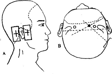 A:耳前及耳后野的设置 B:两射野中轴的交叉点