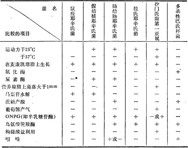 表11-8 四种耶辛氏菌与沙门氏菌第一亚属——多杀性巴氏杆菌的比较
