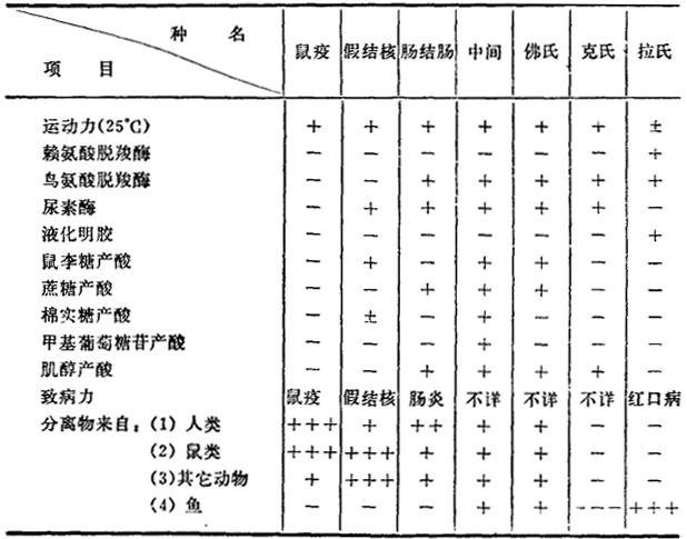 肠结肠耶辛氏菌对豚鼠、家兔、大自鼠多无致病性,仅少数菌株对小白鼠有致病力,根据其O抗原结构,最少有48个血清型,共中O9与牛、羊、猪布氏杆菌,有极强的交叉凝集反应,可用间接血凝鉴定。 四、拉氏耶辛氏菌(Y.ruckeri) 本菌最早从患红口病的虹鳟(Salmo gairdneri)分得,并证实是该病的病原,以后从鲑鱼(Oncorhynchus tshawytscha)发现,可能还可感染其他鱼类,尚未在中国发现,故对进口鱼进行检疫,特别是从北美来的鱼。 此菌最适宜的培养温度为22℃,在营养琼脂或麦康克琼脂上均易生长,22℃下培养18h即呈现圆形约1mm不发酵乳糖的菌落,大小为1μm×2~3μm,若培养时间超过48h,可呈丝状。有5个不同的O抗原血清型。 鉴定此菌要点为该菌属肠杆菌科的细菌,似耶辛氏菌属,从病鱼分得,培养于22℃下能液化明胶和产生赖氨酸脱羧酶。 表11-10 耶辛氏菌属的七个种的比较