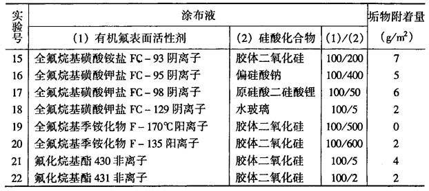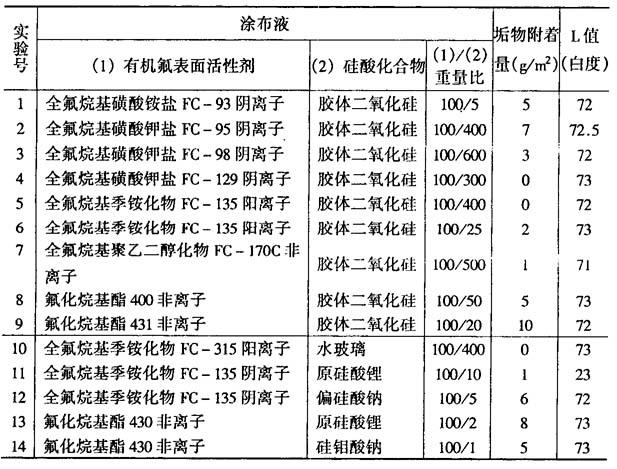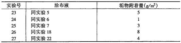 (2)苯丙共聚物的制造 可按表2所列的各种涂布液,即先配制0.5%有机氟表面活性剂的甲醇溶液,再以硅酸化合物用少量的水溶解(或分散)后,与甲醇溶液混合。将所得的溶液涂布于内容积20L搪玻璃内衬的聚合釜内壁、搅拌轴、搅拌叶片,及其他与单体接触的部位,在40℃下约干燥2分钟后水洗,形成涂膜。再在此反应釜中加入水7.5kg、甲基丙烯酸甲酯4kg、苯乙烯1kg、叔十二烷基硫醇25g、聚乙烯醇5g和α,α′-偶氮二异丁腈25g,然后在80℃下聚合5小时。聚合结束后,测定反应器内壁的垢物,结果列于表2。 表2