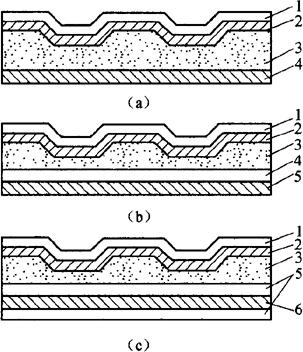 2.不发泡聚氯乙烯印花卷材地板 这种卷材地板与印花塑料地板砖的结构相同,也可由三层组成。面层为透明聚氯乙烯膜,起着保护印刷图案的作用;中间层为印花层,是一层印花的聚氯乙烯色膜;底层为填料较多的聚氯乙烯树脂,有的产品以回收塑料为底料,这样可以降低生产成本。其表面一般有橘皮、圆点等压纹,以降低表面的反光,但仍保持一定的光泽。不发泡聚氯乙烯印花卷材地板通常采用压延法生产,其尺寸外观、物理机械性能,基本上与软质聚氯乙烯单色卷材地板相接近,但其印刷图案的套色精度误差应小于1mm,印花卷材还要有一定的层间剥离强度,且不允许有严重翘曲。它可用于通行密度不高、保养条件较好的公共和民用建筑。 3.印花发泡聚氯乙烯卷材地板 这种印花卷材地板的结构与不发泡印花卷材地板的结构相近,其底层是发泡的,表面有浮雕感,它一般由三层组成。面层为透明的聚氯乙烯(PVC)膜;中间为发泡的聚氯乙烯(PVC)树脂;底部为底布,通常用矿棉纸、玻璃纤维布、玻璃纤维毡、化学纤维无纺布等,其结构如图23-1a所示。也有的印花发泡PVC卷材地板在底衬材料下面加上一层PVC底层,使底衬平整,便于印刷,其结构如图23-1b所示。还有一种是底布采用玻璃纤维布。在玻璃纤维布的上下均加一层PVC底层,这样可提高平整度,防止玻璃纤维外露,这类地板称为增强型印花发泡PVC卷材地板,其结构如图23-1c所示。