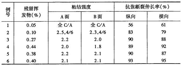 PMDA=均苯四酸二酐;BPDA=3,3′4,4′-联二苯四甲酸二酐;PPD=对苯二胺;ODA=4,4′-二氨基二苯醚。 其二,为进一步改善聚酰亚胺薄膜的粘结性,薄膜中残留挥发物的量应在0.45%以下。此外,薄膜表面的氧碳比还应为0.01%~0.1%。也就是说,对这种薄膜进行电晕放电处理可以进一步提高其粘结能力。 例10~13 将均苯四酸二酐和4,4′-二氨基二苯醚,按上法制成厚为50μm的聚酰亚胺薄膜。将此薄膜加热处理,制成残留挥发物不同的薄膜。然后在其两面以200W/(m2·min)进行电晕放电处理。薄膜的残留挥发物量、表面氧/碳比的增加值及粘结强度列于表3。 例14~16 按与例10~13相同的方法,制成厚75μm的聚酰亚胺薄膜,在450℃下加热处理1分钟,再进一步对此薄膜进行电晕放电处理或等离子体处理,使薄膜的氧/碳比不同,其粘结强度等性能也不同,见表3。但其粘结性能都有不同程度的改善。 表3 表面经等离子体处理的聚酰亚胺薄膜的性能