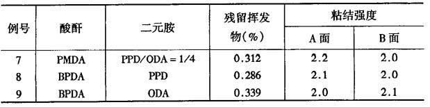 注1:粘结强度:粘结剂为尼龙/环氧树脂系,电路花纹宽度为1.5mm(铜箔35μm厚),温度90℃;剥离速度:50mm/min。 注2:抗张断裂伸长率:15mm宽,间隔100mm;试验速度:200mm/min。 注3:表中的数值是聚酰亚胺薄膜与粘结剂的胶合被破坏的值,kg/cm;全C/A表示6片铜箔全被粘结剂破坏;x/6表示6片铜箔中x片铜箔被破坏。 例7~9 采用与例1~4相同的方法(相同摩尔数的配比),制成聚酰亚胺薄膜,然后测定其粘结强度,结果列于表2。 表2 几种不同的聚酰亚胺膜的性能