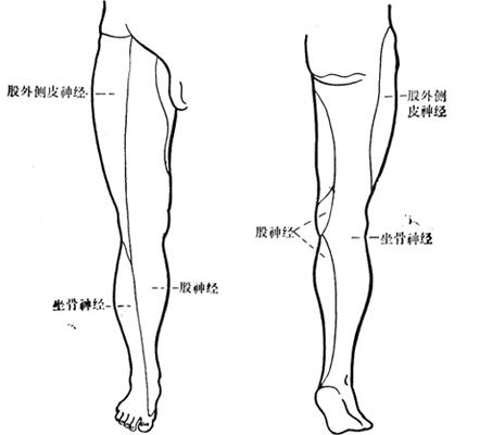 【解剖】 股神经来自腰2~4脊神经,沿髂腰肌及髂骨肌下行,穿过腹股沟韧带的下方进入股部。在腹股沟韧带的下方,股神经位于股动脉的外侧,二者并行伴随而出腹股沟韧带。在股三角处股神经分为前、后二组,然后分布于大腿内侧(股前皮神经)及小腿内侧(阴神经)的皮肤和肌肉,其分布范围在整个下肢的内侧面,上起于卵圆窝的下方,下止于内踝下(图14)。