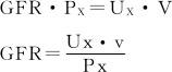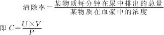 C为清除率(ml/min);U为尿中某物质的浓度(g/L);V为每分钟尿量(ml/min);P为血浆中某物质的浓度(g/L)。 利用清除率可分别测定肾小球滤过率、肾血流量、肾小管对各种物质的重吸收和分泌作用。 (一)肾小球滤过率(GFR) GFR的定义:单位时间(分钟)内从双肾滤过的血浆的毫升数,为测定肾小球滤过功能的重要指标。 假设: X:存在于血中并能从肾小球滤过的某物质。 PX与UX:分别代表X在血浆中和尿内的浓度。 V:每分钟尿量。 E:每分钟从肾小管排泌的X物质的量。 R:每分钟由肾小管重吸收的X物质的量。 以上所用浓度单位相同。 则:GFR·PX=UX·V+R—E 如果X在肾小管内不被重吸收也不排泌,只由肾小球滤过并清除则上述公式为: