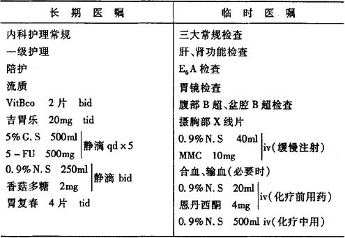 说明:(1)有手术条件时应尽早手术治疗,中晚期胃癌手术前后须化疗。 (2)加强支持营养治疗,贫血严重者输血治疗,不能进食者可静脉营养疗法。 (3)有并发症时如出血、幽门梗阻、穿孔、粘连等作相应处理。 (4)凡未作根治性切除的患者或不能手术者,可试用联合化疗。 (5)胃癌联合化疗一般以5-FU及MMC为基药,常用MF方案及FAM方案。MF方案:MMC8~10mg+生理盐水40ml静脉注射,第1天;5-Fu 500~750mg+5%葡萄糖500ml静滴,第1~5天,每28天重复1周期,4~5周期为一疗程,2年内用3疗程。 |