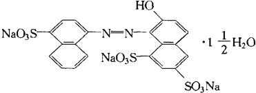 C20H11N2Na3O10S3·1 性状 红色至深红色均匀粉末或颗粒,无臭。耐光、耐热(105℃)性强。对柠檬酸、酒石酸稳定。耐还原性差,遇碱变为褐色。易溶于水呈红色溶液。溶于甘油,难溶于乙醇,不溶于油脂。 制法 1-氨基4-萘磺酸重氮化与2-萘酚-6,8-二磺酸偶合。 质量标准