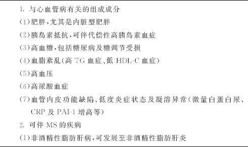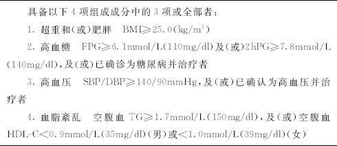 (1)肥胖病:肥胖病是MS的主要临床代谢病组成成分之一。在芬兰进行的一项研究发现,只有肝脏脂肪含量与体内胰岛素水平有非常好的相关性,因此,用内脏脂肪含量、而不是腹腔脂肪含量作为衡量IR的指标更为合理。MS患病率与腰围或腰臀比增加的关系比与体质指数(BMI)增加的关系更为密切。目前内脏脂肪含量较直接的估测方法是用腹部核磁共振或CT检查计算脂肪面积,一般将内脏脂肪面积≥100cm2认为是内脏型肥胖的诊断切割点。 研究中国成年人内脏型肥胖频率与BMI的关系时发现,中国人有总体脂肪不多但是体脂易在腹腔内积聚的倾向,表明在中国人中内脏脂肪积聚时对健康的危害性较大。 现在以色列医生Aronson研究发现,受试者达到代谢综合征诊断的个数越多,C反应蛋白(CRP)水平也越高,但按体重指数校正后,这种趋势明显减弱,故说明肥胖是导致MS相关的慢性亚临床炎症最重要的因素。而CRP水平可以反映冠心病的风险,能预测心肌梗死的危险,同时它还是不稳定性心绞痛预后不良的标志之一。 内脏脂肪细胞的代谢比皮下脂肪细胞活跃,故内脏型肥胖时脂肪细胞内的TG易分解形成游离脂肪酸(FFA),FFA释入循环增加,即发生了脂肪外溢(spillover)。在高FFA血症环境下,许多非脂肪组织内代谢发生了变化,其中变化之一是这些组织器官内出现TG沉积。脂肪细胞尚分泌多种脂肪细胞因子。肥胖时这些脂肪细胞因子的分泌变化不但涉及以脂肪形式进行的能量储存及释放,尚涉及组织的胰岛素敏感性、低度炎症反应及凝溶异常。细胞因子间的相互作用及细胞因子的多重作用致上述机制间发生交互联系。 (2)胰岛素抵抗:综合估测组织处置血糖能力的经典方法是高胰岛素正糖钳夹技术。它是测定的胰岛素介导的葡萄糖代谢率[M值,mg/(kg·min)],用以测定组织对外源性胰岛素敏感性,是国际上评估IR的金标准,此方法可避免了“内源性胰岛素缺乏”(如在糖尿病患者)及“低血糖”(如在胰岛素耐量试验中)对胰岛素敏感性测定的影响,成为在糖耐量正常、糖耐量减低及糖尿患者群均可信赖的技术。但因这种测定是一种有创伤的检查,取血次数太多,而且耗时较长,费用也很昂贵,难于被患者接受,故目前还发展了许多根据空腹和(或)负荷后血糖及胰岛素水平间的关系而演算成的胰岛素敏感性的简易估算公式,这些公式便于流行病学及临床研究。其中,应用较普遍的是稳态模型(homamodel)的胰岛素抵抗指数评估公式——HOMA-IR(空腹血糖×空腹胰岛素/22.5)。各种群,包括中国人的研究在内均见到个体具备的MS组成成分越多,IR程度越高。另一方面,IR越明显的人群中MS的患病率亦越高。中华医学会糖尿病学分会认为在流行病学或临床研究时IR程度可用简易公式如应用HOMA-IR进行估测,可用所研究特定人群的上四分位数作为IR的分割点。由于胰岛素测定方法尚不一致,所以必须用取得研究样本的背景人群数据来确认其分割点。 (3)糖尿病、血脂紊乱及高血压:大多数学者对MS的工作定义中包括了这三个组成成分,至于三者在诊断MS中应用的切割点则各家有较明显差异。三者具体与代谢综合征关系见本章第二节。 (4)心血管病:MS的主要后果是心血管病。心血管疾病是影响2型糖尿病患者死亡率的主要因素,因此糖尿病与心血管病之间的关系受到深入的关注和研究。胰岛素抵抗和代谢综合征导致动脉粥样硬化的主要危险因素是小而密的低密度脂蛋白(LDL)颗粒的增加以及高密度脂蛋白(HDL)的减少。此外,促炎状态和高凝也增加代谢综合征患者的心血管危险。 2001年美国国家胆固醇教育纲要-成人教育组第3次报告(NCEP-ATPⅢ)中指出,糖尿病患者与已有冠心病者在10年内发生新的冠心病事件的危险程度相等,即呈等危情况。在临床上确认MS对预测个体发生心血管病有重要意义。 2.诊断标准 目前无一致公认并适用于各种群的MS诊断标准。除WHO诊断标准外,NCEP-ATPⅢ、欧洲胰岛素抵抗研究组(EGIR)以及美国临床内分泌医师学会(AACE)尚分别从不同角度提出了以MS(NCEP-ATPⅢ标准)或以IR综合征命名的诊断标准(表14-2)。现在,中华医学会糖尿病学分会根据目前在中国人群中用WHO标准及NCEP-ATPⅢ标准进行MS诊断的资料分析结果及在中国人群中对MS的研究结果,结合目前中国常用临床检测项目情况,提出在中国人群中的MS的诊断标准(CDS诊断标准)(表14-3)。 表14-2 MS/胰岛素抵抗综合征诊断标准比较