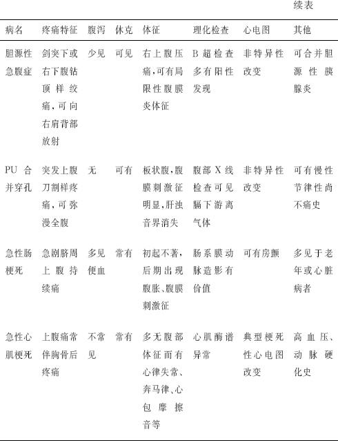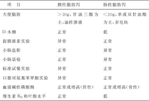 (2)消化性溃疡 1)慢性周期性节律性上腹痛,常伴烧心、吐酸等消化不良症状,抗酸剂可缓解。 2)体征不明显,可有上腹部压痛。 3)急性穿孔时可呈板状腹,腹膜刺激征阳性。 4)十二指肠球后壁溃疡穿透至胰腺可引起顽固性疼痛。 5)上消化道造影可见拿影,内镜检查可确诊。 (3)肠性脂肪泻慢性胰腺炎引起的脂肪泻称为胰性脂肪泻,应注意与肠性脂肪泻鉴别。见表6-3。 表6-3 胰性脂肪泻与肠性脂肪泻的鉴别