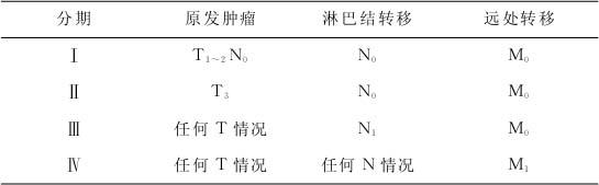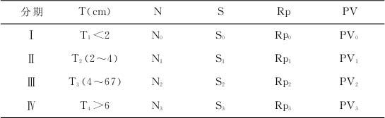 (五)UICC的胰腺癌分期标准 UICC分期(表22—2):T指肿瘤大小以及侵犯邻近组织情况,其第Ⅰ期包括肿瘤局限于胰腺组织(T1)以及侵犯十二指肠、胆管或胰周围组织但无淋巴结转移者(T2);第Ⅱ期包括肿瘤已侵犯胃、脾、结肠或邻近大血管而无淋巴结转移(T3N0);第Ⅲ、Ⅳ期分别指淋巴结和远处转移。 表22—2 UICC分期(按TNM分期法)