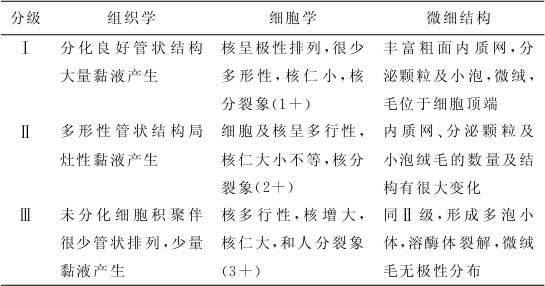 五、分类及分线 (一)胰腺癌的分类(日本胰腺癌处理规约) 1.上皮性肿瘤 (1)外分泌肿瘤 1)浆液性囊性肿瘤:浆液性囊腺瘤、浆液性囊腺癌。 2)黏液性囊性肿瘤:黏液性囊腺瘤、黏液性囊腺癌。 3)胰管内肿瘤:胰管内乳头状腺瘤、胰管内乳头状腺癌、原位癌。 4)浸润性导管癌:乳头状腺癌、管状腺癌(高、中、低分化)、腺鳞癌、黏液癌、未分化性胰管癌、巨细胞癌(多形细胞癌)、来源于黏液性囊腺癌、浸润性导管癌、纺锤细胞癌、来源于胰管内乳头状腺癌的浸润性导管癌。 5)腺泡细胞肿瘤:腺泡细胞腺瘤、腺泡细胞癌。 (2)内分泌肿瘤。 (3)依存肿瘤。 (4)分化不明的上皮性肿瘤。 (5)不能分类的肿瘤。 (6)其他。 (7)异形增生。 2.非上皮性肿瘤 (二)胰腺癌的分级 Kloppel等的分级见表22—3。 表22—3 胰腺癌的分级(Kloppel et al.1982)