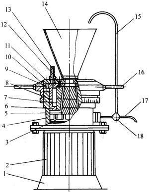 图4-3-4 立式胶体磨 1-机座 2-电机 3-叶轮 4-磨体 5-动磨盘 6-静磨盘套 7-静磨盘 8-密封圈 9-限位螺钉 10-调节轮 11-盖板 12-联结螺钉 13-进、出冷却水管 14-料斗 15-循环管 16-调节手柄 17-出料管 18-三通阀