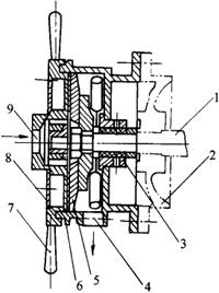 图4-3-5 卧式胶体磨 1-工作主轴 2-壳体 3-密封装置 4-出料口 5-动磨盘 6-静磨盘 7-调整手柄 8-挡盖 9-进料口 立式胶体的工作主轴与地面垂直,卧式胶体磨的工作主轴与地面平行。胶体磨由动、静齿盘组成工作件。动齿盘呈锥形,安装于主轴上,外表面有纵向的齿槽,由上至下分为粗、中、细三个环带,材料为不锈钢或硬质合金钢,表面硬度一般不低于HRC35-45。静齿盘固定于壳体上,呈倒锥形与动磨盘相对应,其中粗、中、细齿槽分成三个零件加工,然后装成一个整体,材料为不锈钢,齿面要经过硬化处理,动、静齿盘锥形齿槽面的接触面积大于50%,组装后同轴度误差不超过0.05mm。根据物料不同,两齿盘间隙可利用调整机构进行微量调节。当物料通过间隙时,由于动磨盘的高速旋转,使被加工物料通过其可变环状间隙时,在自重、离心力等复合作用下,物料间产生强烈的剪切、磨擦、挤压、冲压作用,从而使物料产生分散和乳化均质。均质后的物料细度一般为5~20μm,最细的物料直径可达1μm以下。 (三)主要技术参数(表4-3-2) 表4-3-2 胶体磨主要技术参数